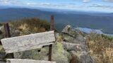 這松の中をどんどん高度を上げていき、標高が高くなると景色が良くなってきた。屈斜路湖、摩周岳などが見える。一人歩きの百名山のホームページで40分の行程と調べていたが、30分ほどで岩峰に着く。ここかなと思っていたら、まだ先に道が延びている。子供は7時まで帰ってかいけつゾロリを見たいと行っていたが、あきらめさせて歩く。岩峰からは稜線歩きになり、そうこうしているうちに頂上に到着。頂上は霧でなにも見えない。