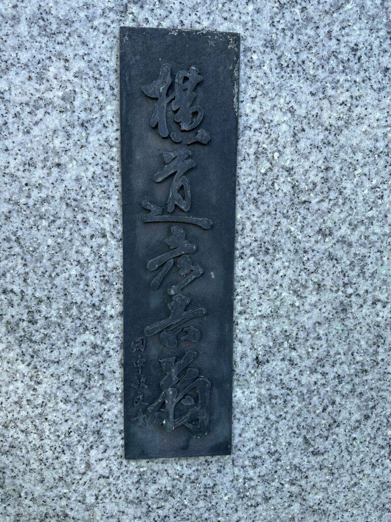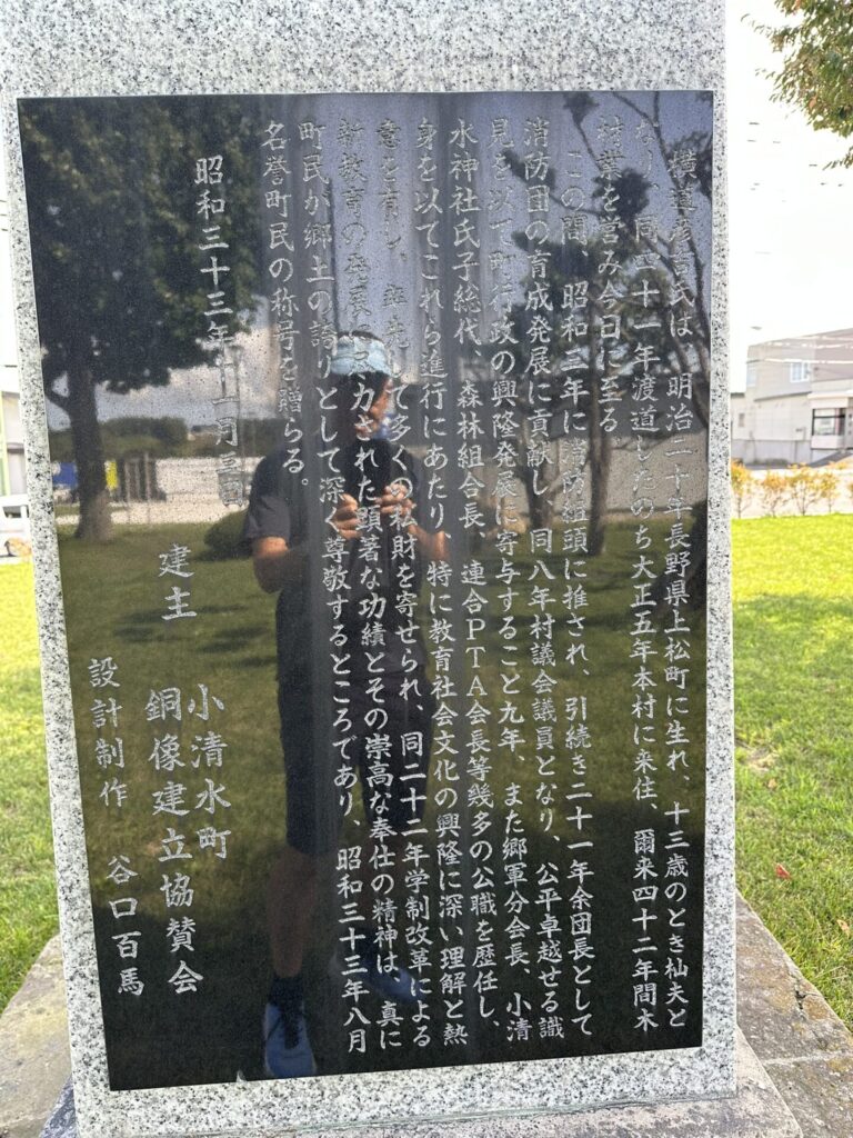消防団の育成発展に貢献し、同八年村議会議員となり、公平卓越せる識見を以て町行政の興隆発展に寄与すること九年、また郷軍分会長、小清水神社氏子総代、森林組合長、連合PTA会長等幾多の公職を歴任し、身を以てこれら進行にあたり、特に教育社会文化の興隆に深い理解と熱意を有し、率先して多くの私財を寄せられ、同二十二年学制改革による新教育の発展に尽力された顕著な功績とその崇高な奉仕の精神は、真に町民が郷土の誇りとして深く尊敬するところであり、昭和三十三年八月名誉町民の称号を贈らる。昭和三十三年十一月三日 建主 小清水町 銅像建立協賛会 設計制作 谷口百馬」