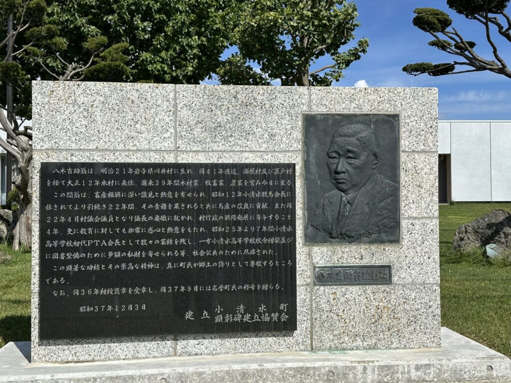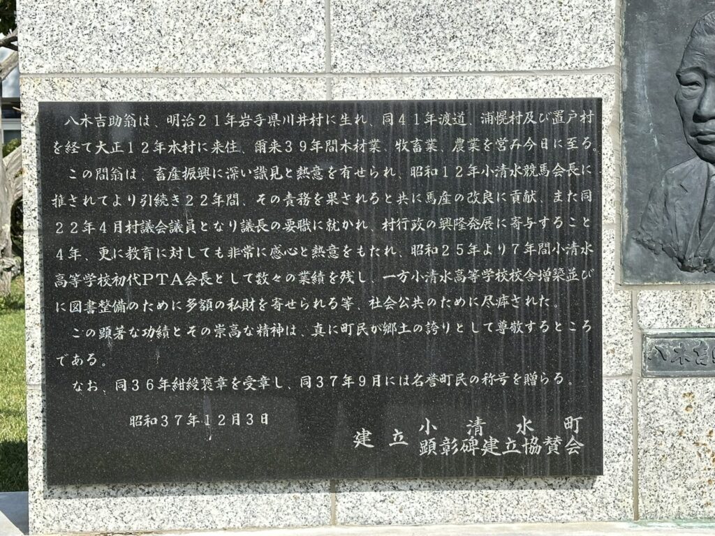 胸像ではないがレリーフとして標記の先人の顕彰碑が設置されていた。碑文には次のとおり記されていた。「八木吉助翁は、明治21年岩手県川井村に生れ、同41年都道、浦幌村及び置戸村を経て大正12年本村に来住、爾来39年間木材業、牧畜業、農業を営み今日に至る。この間翁は、畜産振興に深い識見と熱意を有せられ、昭和12年小清水競馬会長に推されてより引続き22年間、その責務を果たせると共に馬産の改良に貢献、また同22年4月村議員となり議長の要職に就かれ、村行政の隆盛発展に寄与すること4年、更に教育に対しても非常に関心と熱意をもたれ、昭和25年より7年間小清水高等学校初代PTA会長として数々の業績を残し、一方小清水高等学校校舎増築並びに図書整備のために多額の私財を寄せられる等、社会公共のために尽瘁された。この顕著な功績とその崇高な精神は、真に町民が郷土の誇りとして尊敬するところである。なお、同36年紺綬褒章を受章し、同37年9月には名誉町民の称号を贈らる。昭和37年12月3日 建立 小清水町顕彰碑建立協賛会」