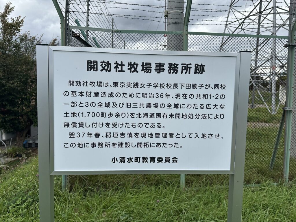 開効社牧場は、東京実践女子学校校長下田歌子が、同校の基本財産造成のために明治36年、現在の共和1・2の一部と3の全域及び旧三共農場の全域にわたる広大な土地(1,700町歩余り)を北海道国有未開地処分法により無償貸し付けを受けたものである。翌37年春、稲垣吉慎を現地管理者として入地させ、この地に事務所を建設し開拓にあたった。小清水町教育委員会