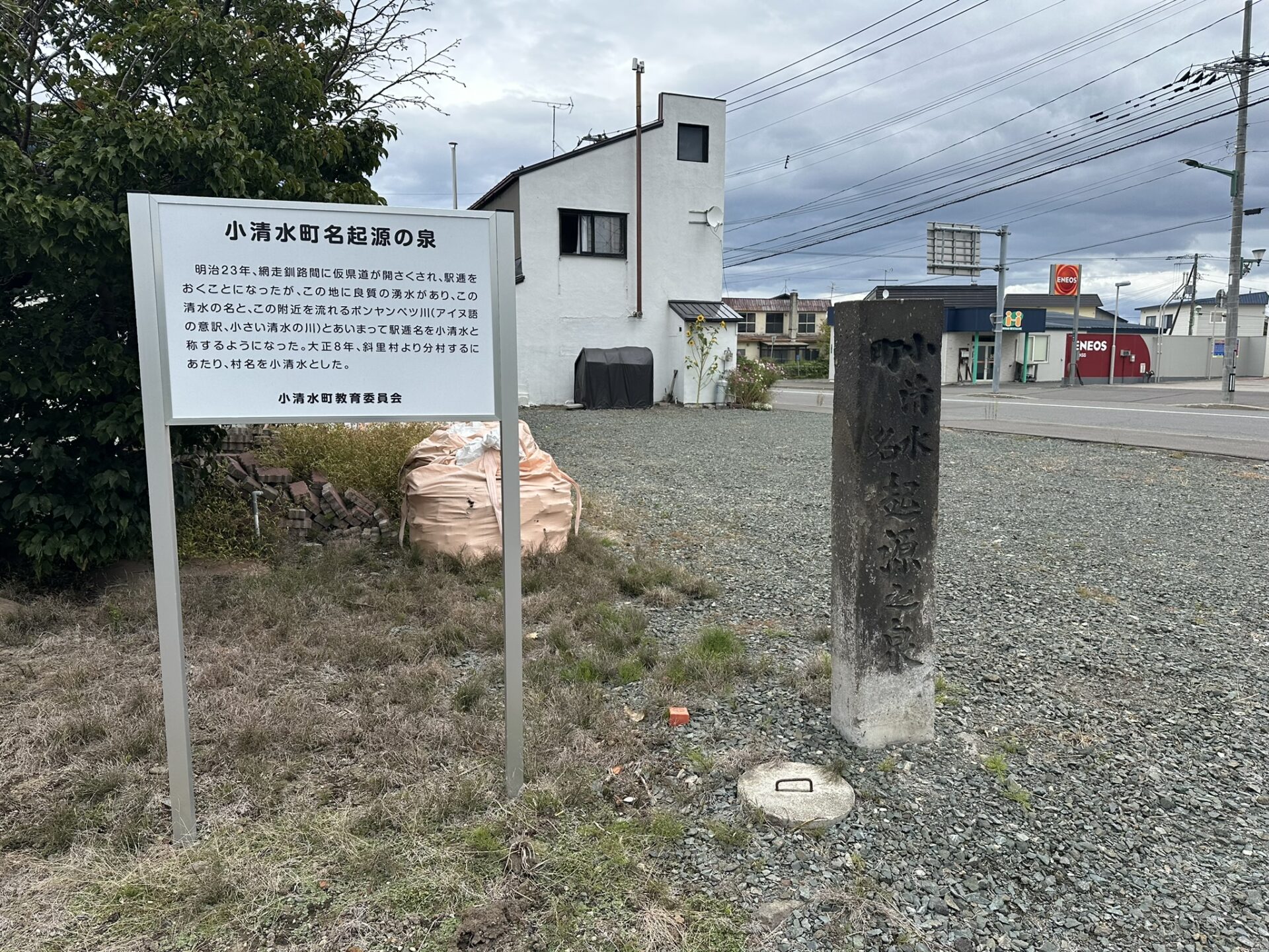 逆風のジャガイモ街道からようやく市街に帰ってくることができた。小清水町内には史跡の石柱と説明版がたくさんある。