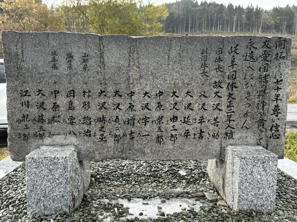 岐阜団体とあるが、山形県や福井県の人も含まれていた。通常開拓者は主人の名前だけだが、奥さんの名前も小さく刻まれていた。この石碑がいつ設置されたかこの石碑だけではわからないが、堂垣内知事は昭和58年まで在籍していたことと、大正2年の70年後が昭和58年なので、その年なのだろうか。