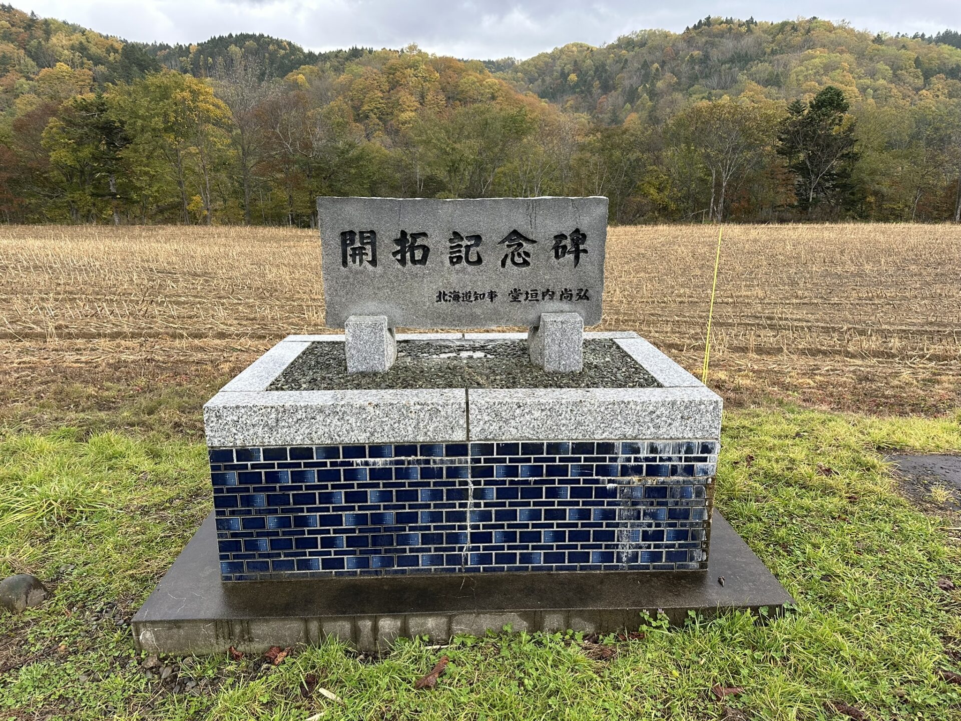 滝上町から西興部村に向かい、道道137号線を走っていると、畑の中に開拓記念碑があった。開拓記念碑の基台にはブルーのタイルが張られている。昔の建物の台所やお風呂、トイレの壁に貼ってあったようなあのタイルであり、とても珍しい開拓記念碑だった。