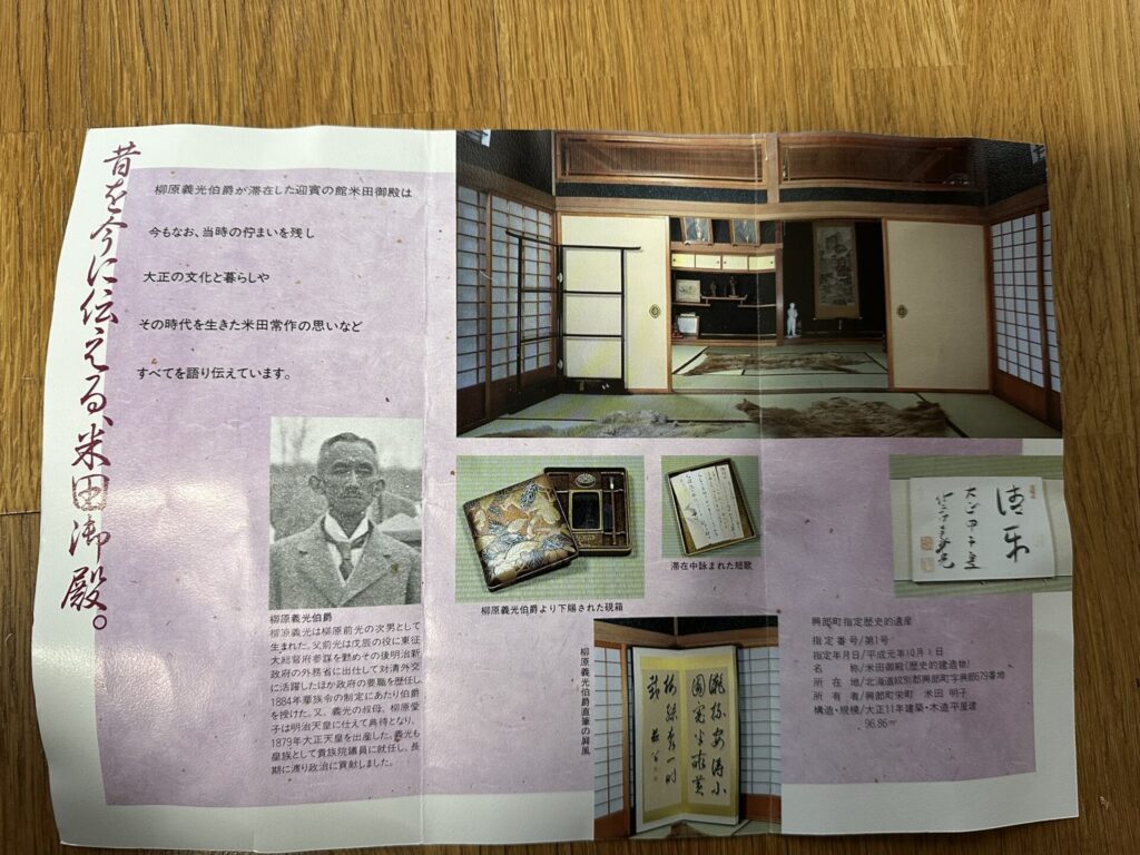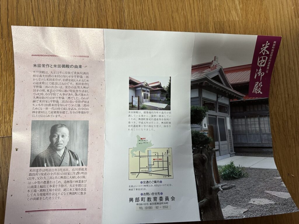 米田御殿は、大正11年に時の皇族で貴族院議員柳原義光伯爵の来村(当時は興部村だった)を受けて、興部村民の米田常作氏が自所有の山林を資材に伯爵を迎え入れる迎賓館として建造したものです。建築後約70年の歳月が経過していることから、後世に継承していくため、興部町歴史遺産保存条例に基づき、平成元年10月1日、興部町歴史遺産第1号の指定を受け、保存されることになりました。