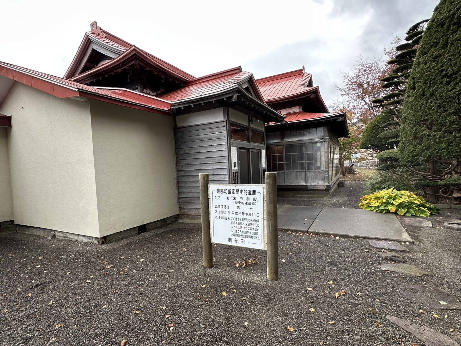 米田御殿は、大正11年に時の皇族で貴族院議員柳原義光伯爵の来村(当時は興部村だった)を受けて、興部村民の米田常作氏が自所有の山林を資材に伯爵を迎え入れる迎賓館として建造したものです。建築後約70年の歳月が経過していることから、後世に継承していくため、興部町歴史遺産保存条例に基づき、平成元年10月1日、興部町歴史遺産第1号の指定を受け、保存されることになりました。