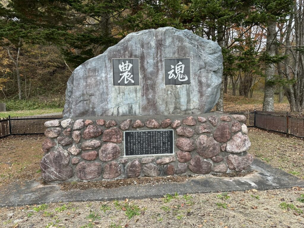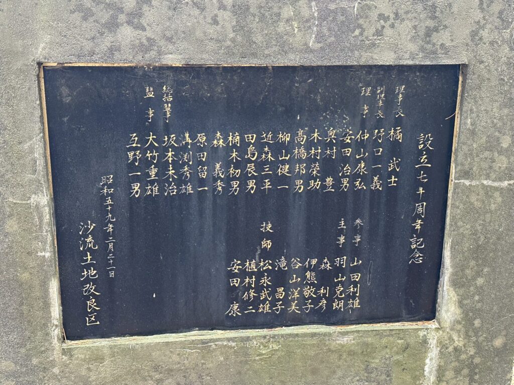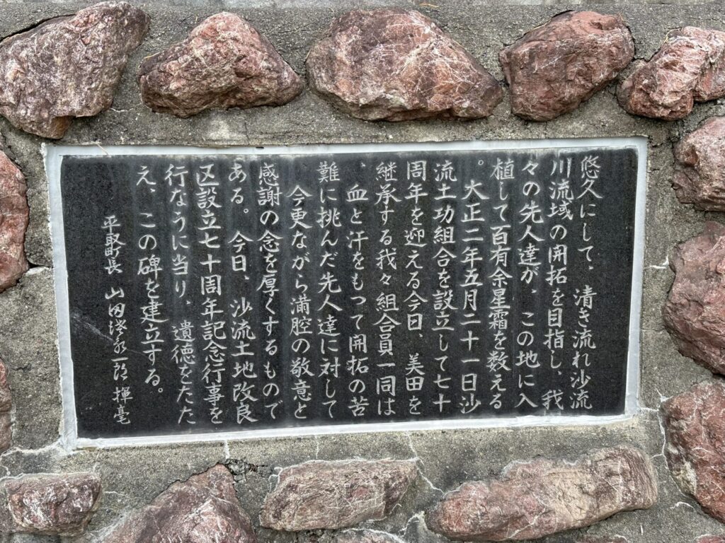 石碑に上記のとおり刻まれ、その下の碑文には次のとおり刻まれていた。「悠久にして、清き流れれ沙流川流域の開拓を目指し、我々の先人達が、この地に入植して百有余星霜を数える。大正二年五月二十一日沙流土功組合を設立して七十周年を迎える今日、美田を継承する我々組合員一同は、血と汗をもって開拓の苦難に挑んだ先人たちに対して今更ながら満腔の敬意と感謝の念を暑くするものである。今日、沙流土地改良区設立七十周年記念事業を行なうに当り、遺徳をたたえ、この碑を建立する。平取町長 山田(不明)揮毫」