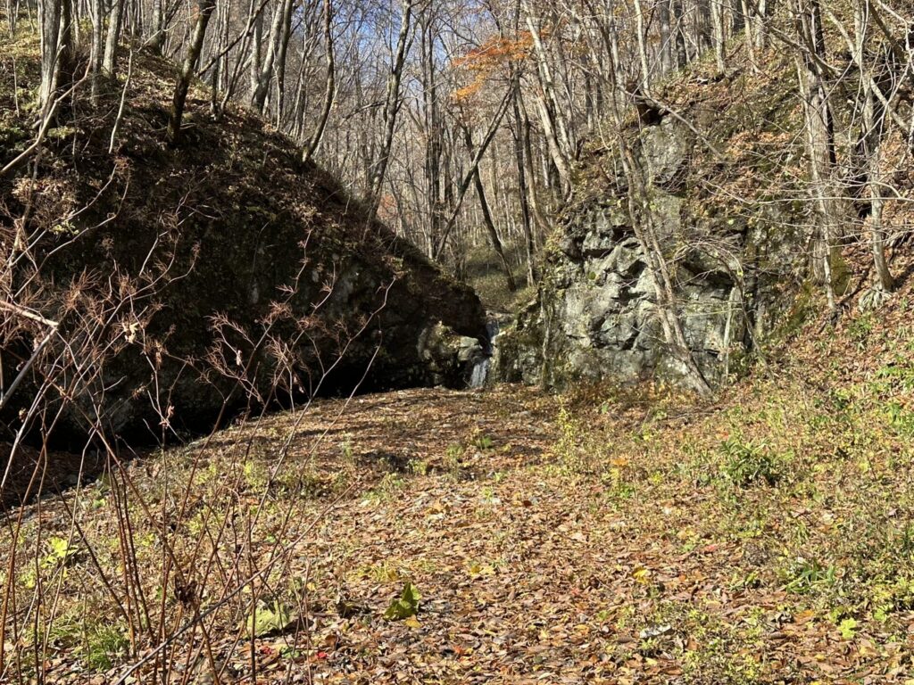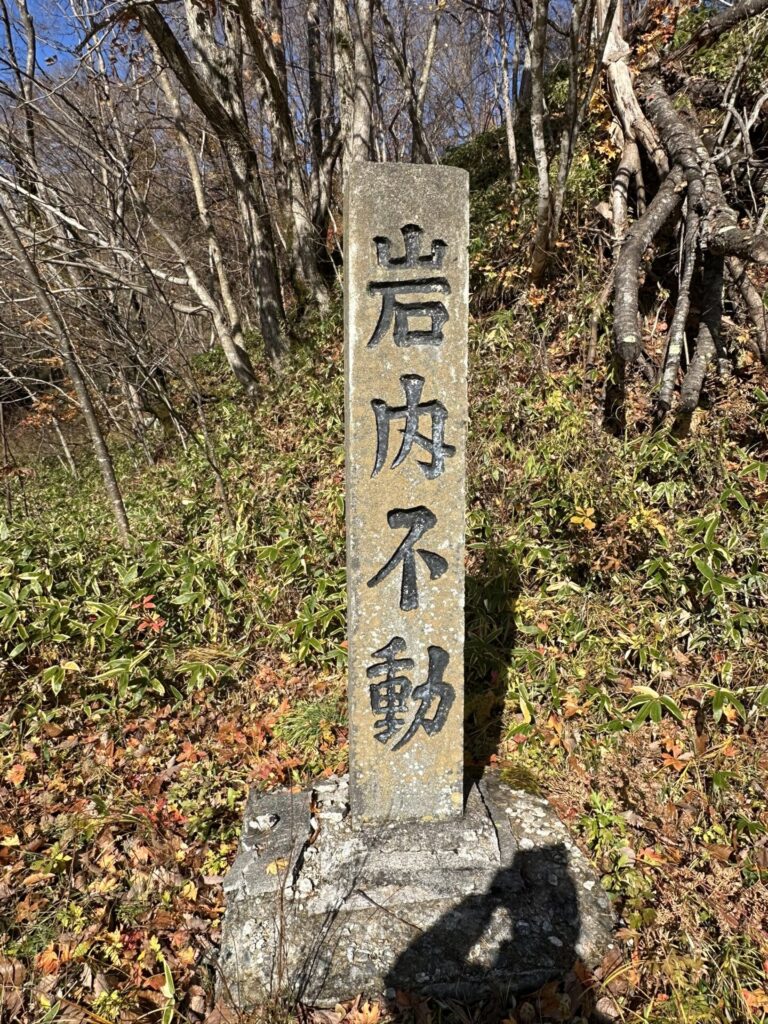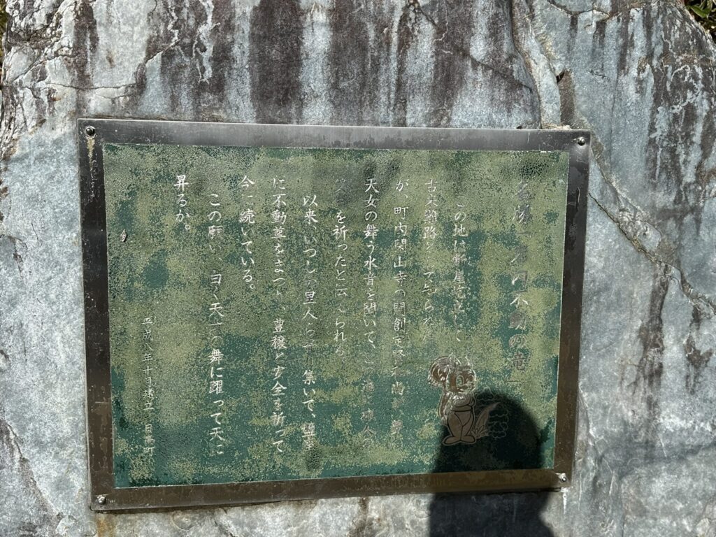 上記のとおり刻まれ、その横に自然石があり、説明版がはめ込まれていた。「名勝 岩内不動の滝 この地は断崖屹立して古来難路として知られていたが、町内関山寺の門創定賢和尚が夢に天女の舞う水音を聞いて、この滝に旅人の安全を祈ったと伝えられる。以来、いつしか里人ら寄り集いて、盤座に不動尊をまつり、豊穣と安全を祈って今に続いている。この願い、白く天女の舞に踊って天に昇るか。平成8年10月建立 日高町」