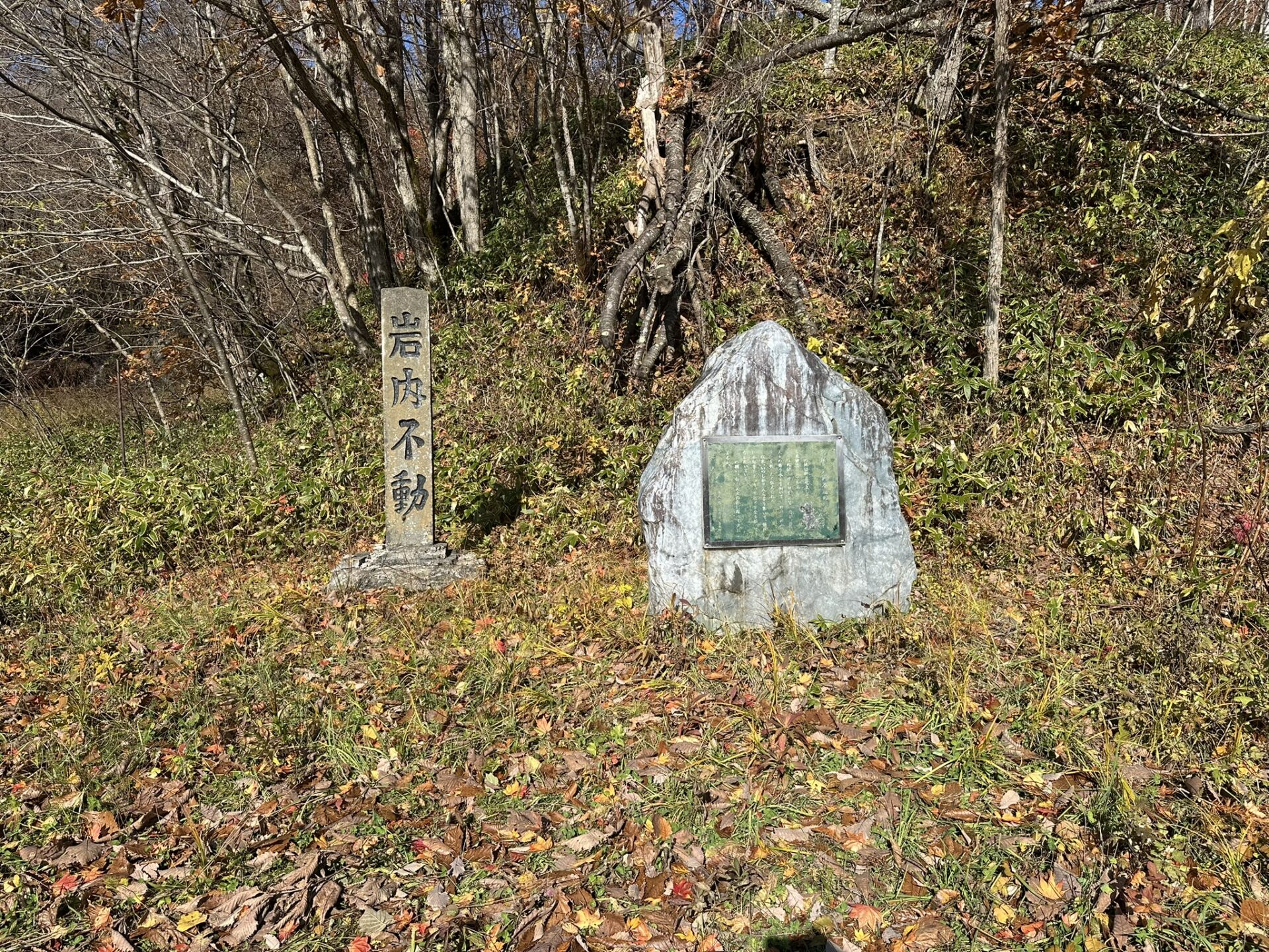 上記のとおり刻まれ、その横に自然石があり、説明版がはめ込まれていた。「名勝 岩内不動の滝 この地は断崖屹立して古来難路として知られていたが、町内関山寺の門創定賢和尚が夢に天女の舞う水音を聞いて、この滝に旅人の安全を祈ったと伝えられる。以来、いつしか里人ら寄り集いて、盤座に不動尊をまつり、豊穣と安全を祈って今に続いている。この願い、白く天女の舞に踊って天に昇るか。平成8年10月建立 日高町」