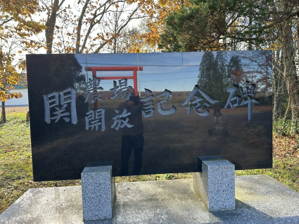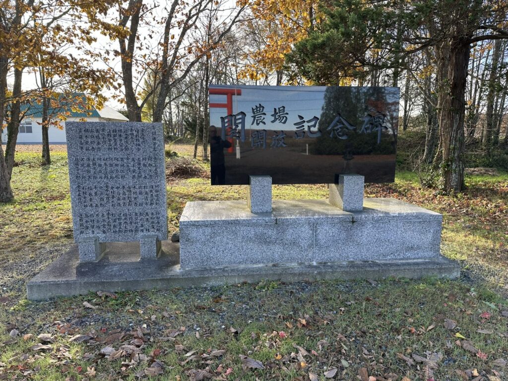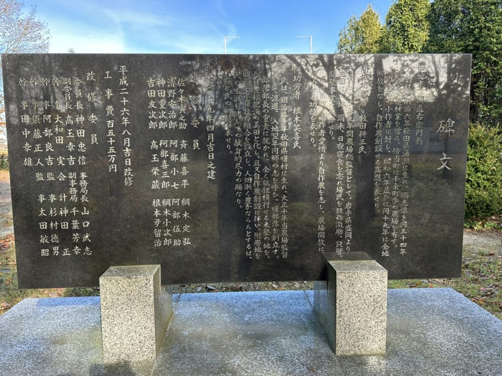 同功労者 根本笑喜氏 氏は、明治二十年秋田県曙村に生れ、大正十年当農場監督として渡道、入地翌年同郷の志を呼び、曙部落を創立す。部落部長の重責に就かれ、全く狐狸横行せる未墾の地を、今日豊穣肥沃の美田と化し、且又自作農創設に伴い、附帯地を昭和七年曙牧野組合を設立し、人畑漸く豊かならんとするは、氏の生涯を賭しての献身的尽力の賜なり。茲に氏の功績を表せり。