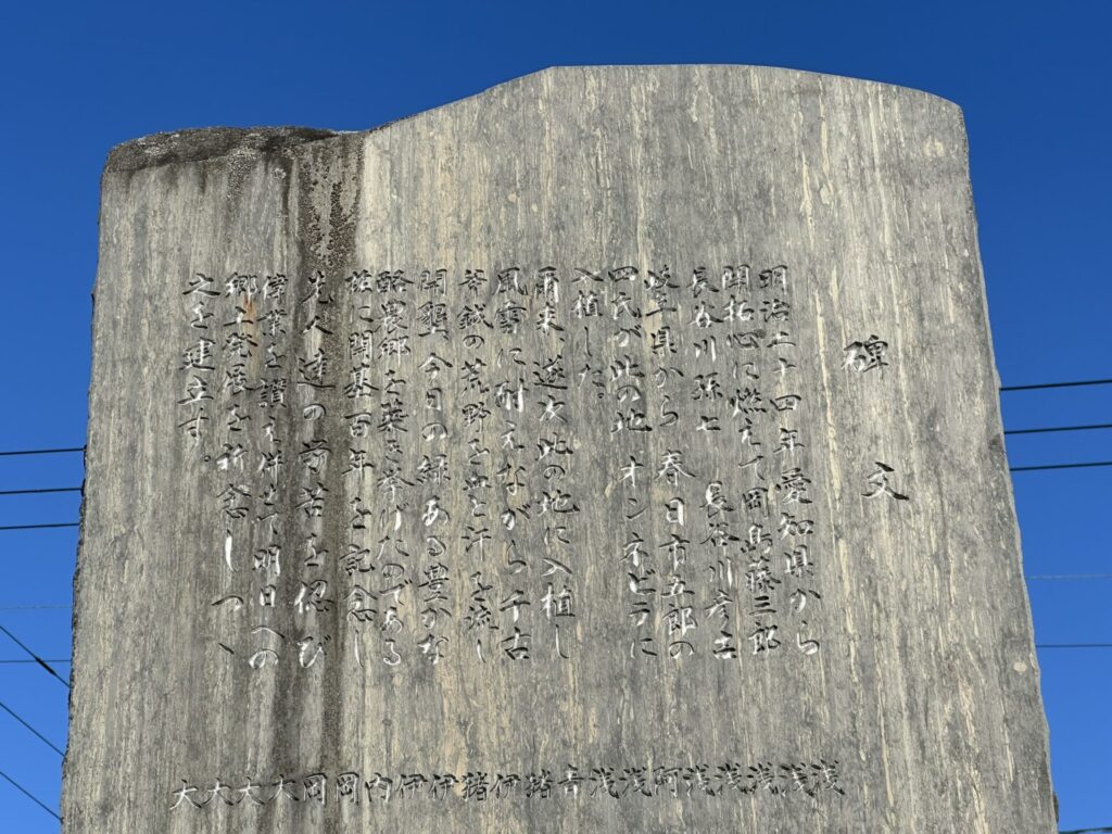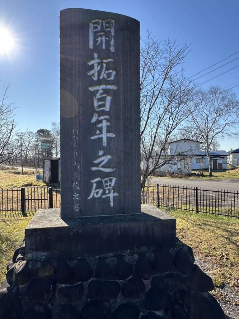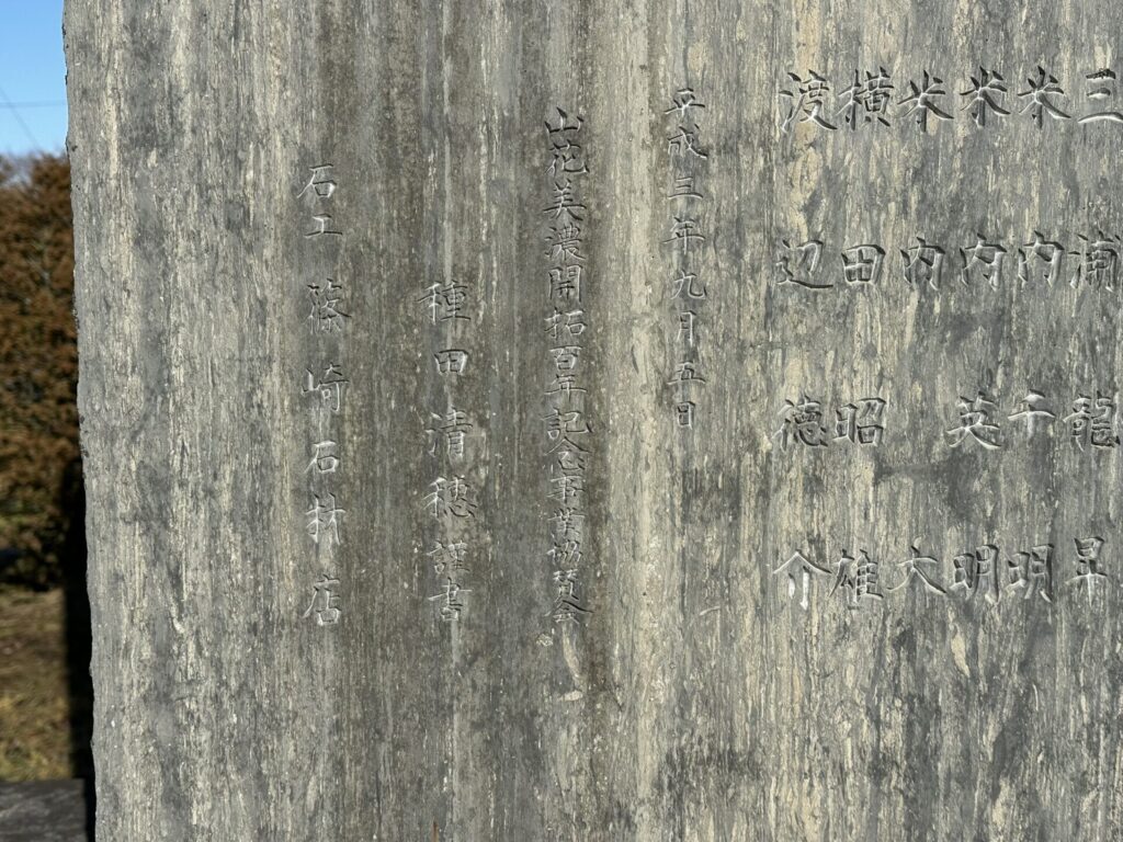 石碑の正面に上記のとおり刻まれ、「釧路市長 鰐淵俊之書」と添えられている。裏面には山花美濃在住者寄付芳名がずらりと刻まれていた。その上の方に碑文が刻まれていた。「碑文 明治二十四年愛知県から開拓心に燃えて岡島藤三郎 長谷川孫七 長谷川彦吉 岐阜県から春日市五郎の四氏が此の地 おんねびらに入植した。爾来、逐次此の地に入植し風雪に耐えながら千古斧鋮の荒野を血と汗と流し開墾、今日の緑ある豊かな酪農郷を築き上げたのである 茲に開基百年を記念し 先人達の労苦を偲び 偉業を讃え併せて明日への郷土発展を祈念しつつ之を建立す。山花美濃開拓百年記念事業協賛会 種田清穂謹書」