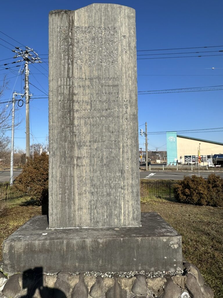 釧路市鶴公園から山花の方に走っていく。クマが心配だが、晴れているし、車も結構通るので大丈夫だろうと思い走る。高速をくぐって道道952号線に右折すると、山花集落に到着した。マルシェ山花の道路向かいに記念碑があった。