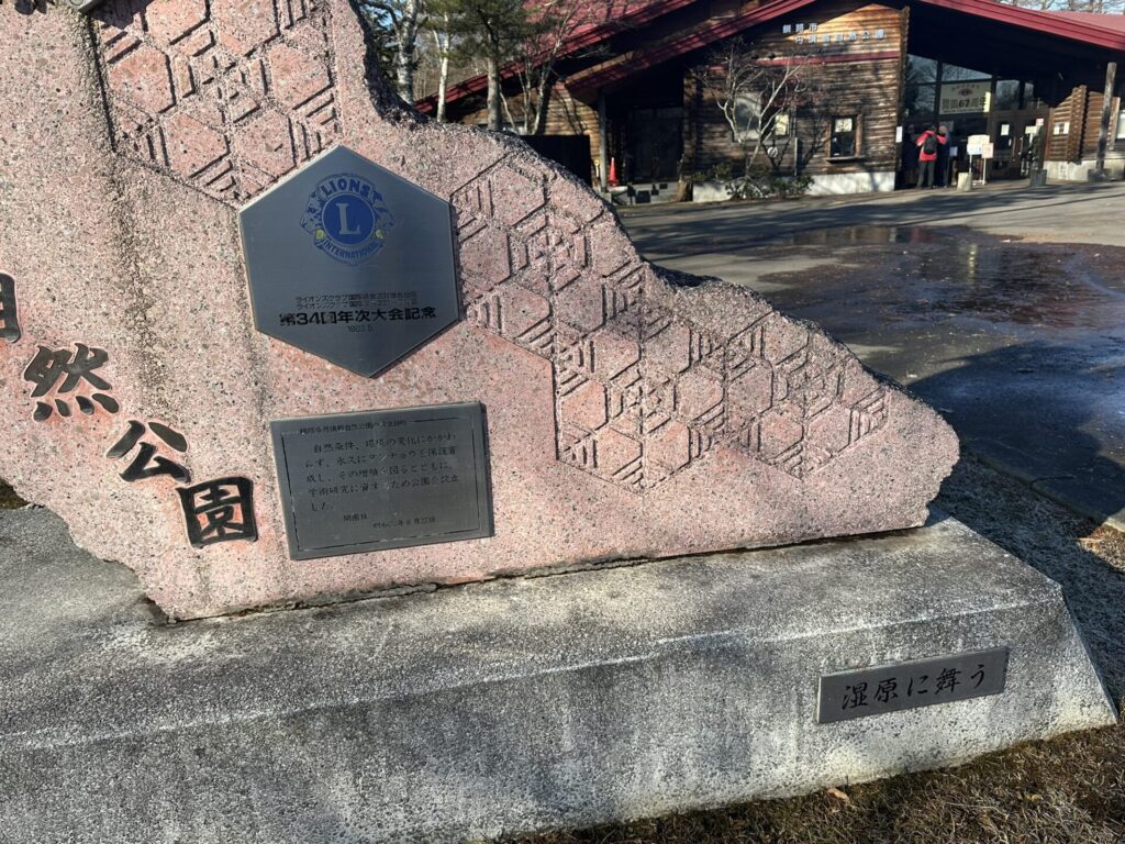 石碑に鶴が飛んでいる姿と、雪の結晶らしきオブジェが乗っかっていた。この公園の設立目的が次のとおりレリーフが張られていた。「釧路市丹頂鶴自然公園の設立目的 自然条件、環境の変化にかかわらず、永久にタンチョウを保護育成し、その増殖を図るととともに学術研究に資するため公園を設立した。開園日 昭和33年8月27日」