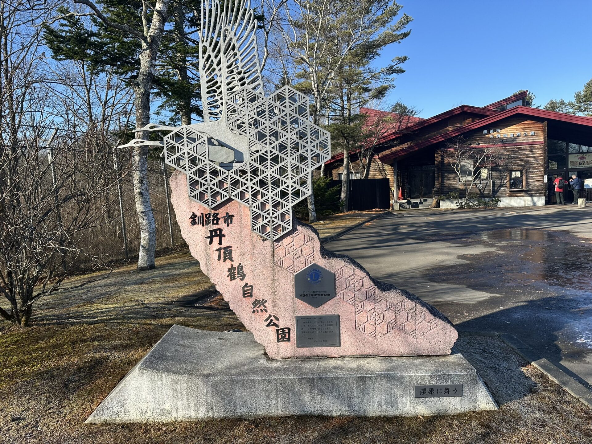石碑に鶴が飛んでいる姿と、雪の結晶らしきオブジェが乗っかっていた。この公園の設立目的が次のとおりレリーフが張られていた。「釧路市丹頂鶴自然公園の設立目的 自然条件、環境の変化にかかわらず、永久にタンチョウを保護育成し、その増殖を図るととともに学術研究に資するため公園を設立した。開園日 昭和33年8月27日」