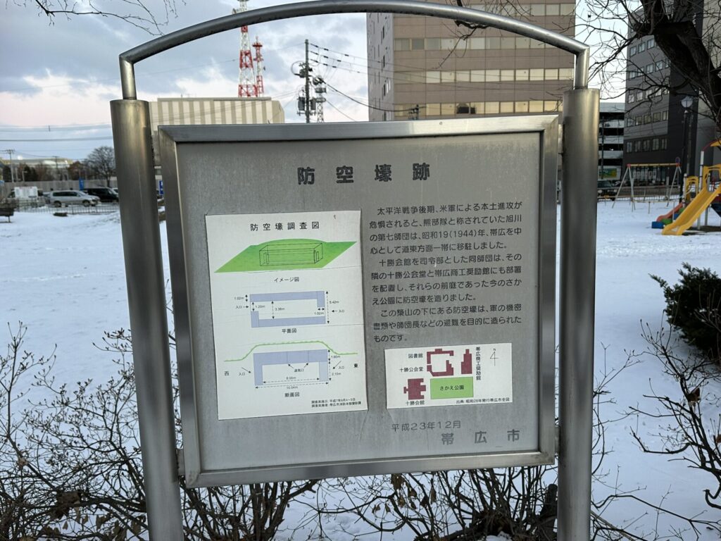 十勝会館を司令部とした同師団は、その隣の十勝公会堂と帯広商工奨励館にも部署を配置し、それらの前庭であった今のさかえ公園に防空壕を作りました。