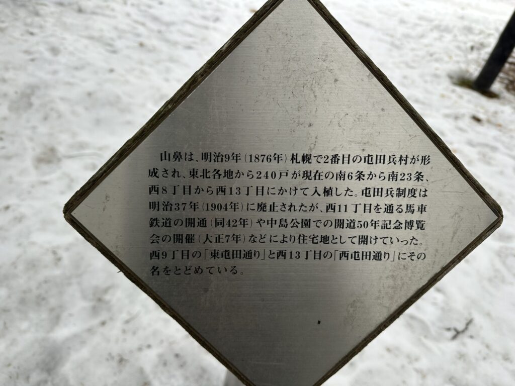 一面には、上記のとおり記され、もう片面には次のとおり記されていた。「山鼻は、明治9年(1876年)札幌で2番目の屯田兵村が形成され、東北各地から240戸が現在の南6条から南23条、西8丁目から西13丁目にかけて入植した。屯田兵制度は明治37年(1904年)に廃止されたが、西11丁目を通る馬車鉄道の開通(同42年)や中島公園での開道50年記念博覧会の開催(大正7年)などにより住宅地として開けていった。西9丁目の「東屯田通り」と西13丁目の「西屯田通り」その名をとどめている。」