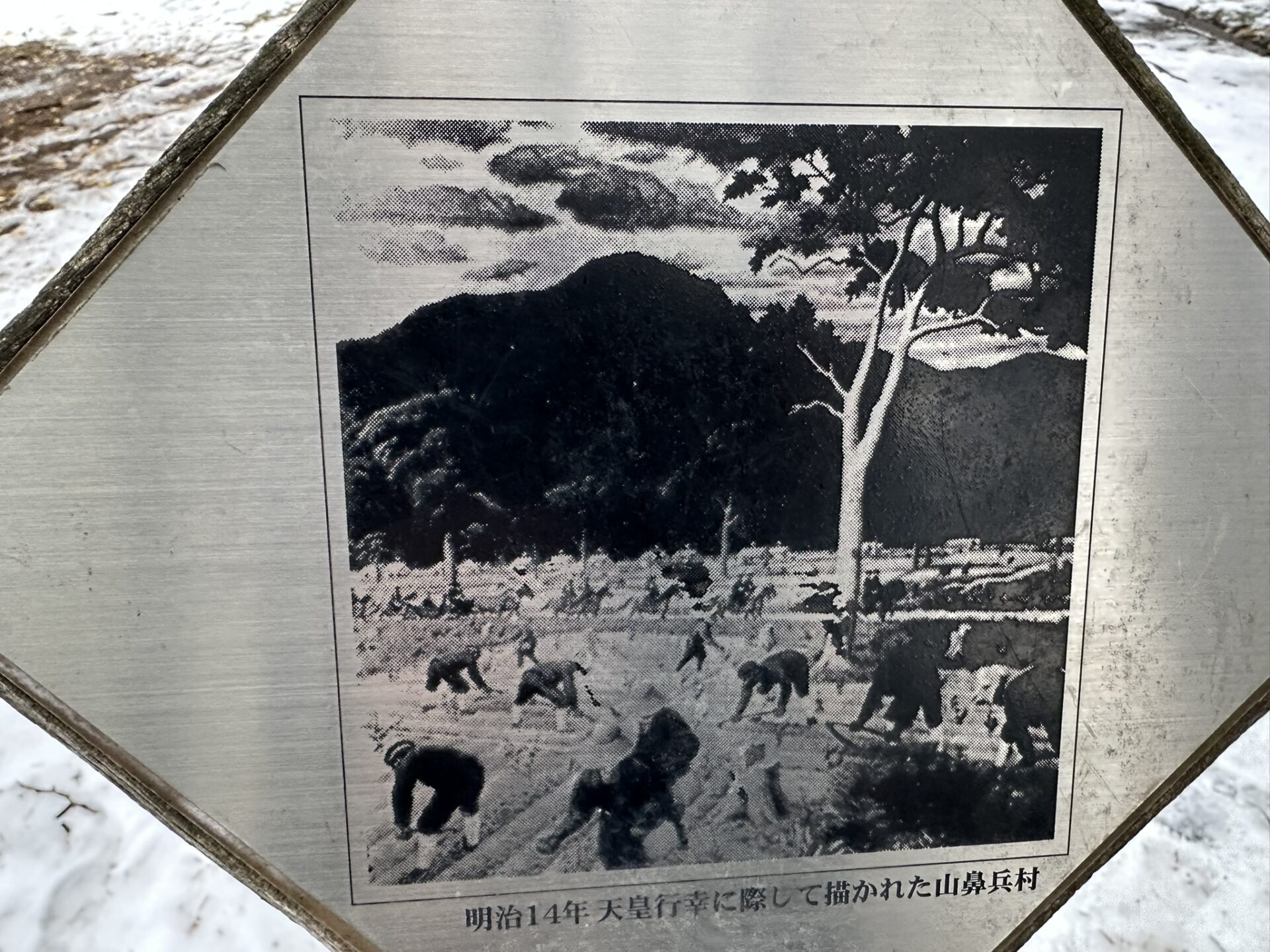 一面には、上記のとおり記され、もう片面には次のとおり記されていた。「山鼻は、明治9年(1876年)札幌で2番目の屯田兵村が形成され、東北各地から240戸が現在の南6条から南23条、西8丁目から西13丁目にかけて入植した。屯田兵制度は明治37年(1904年)に廃止されたが、西11丁目を通る馬車鉄道の開通(同42年)や中島公園での開道50年記念博覧会の開催(大正7年)などにより住宅地として開けていった。西9丁目の「東屯田通り」と西13丁目の「西屯田通り」その名をとどめている。」