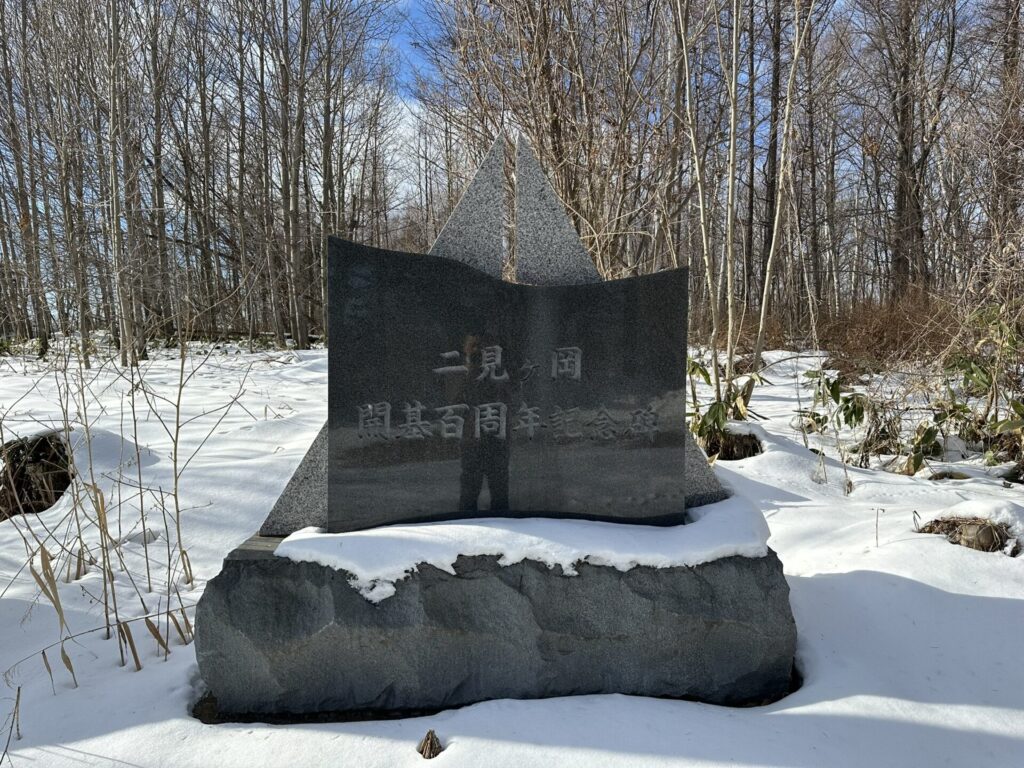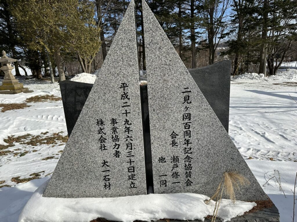 三角型の石に黒御影石がはめ込まれて上記のとおり刻まれている。裏面には「二見ケ岡百周年記念協賛会(氏名省略)平成二十九年六月三十日建立(以下略)」と刻まれていた。
