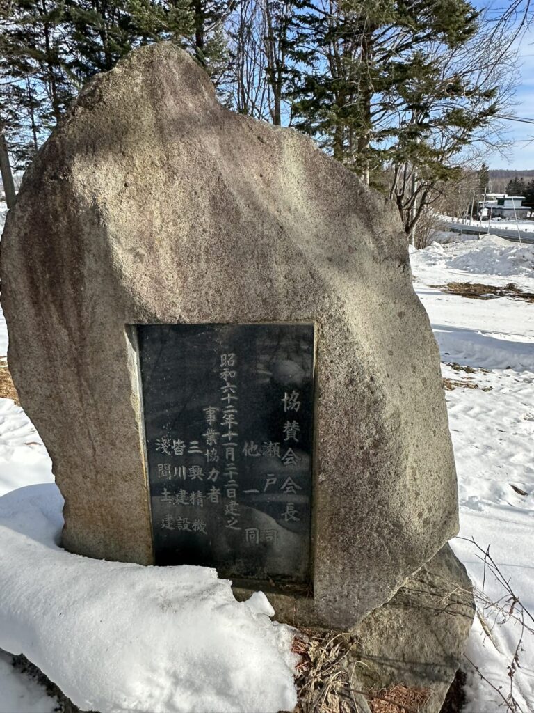 自然石に黒御影石がはめ込まれ上記のとおり残して刻まれている。裏面には「協賛会長(氏名省略)昭和六十二年十一月二十日建立(以下略)」と刻まれていた。