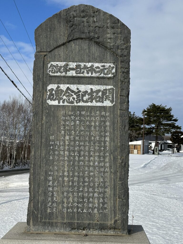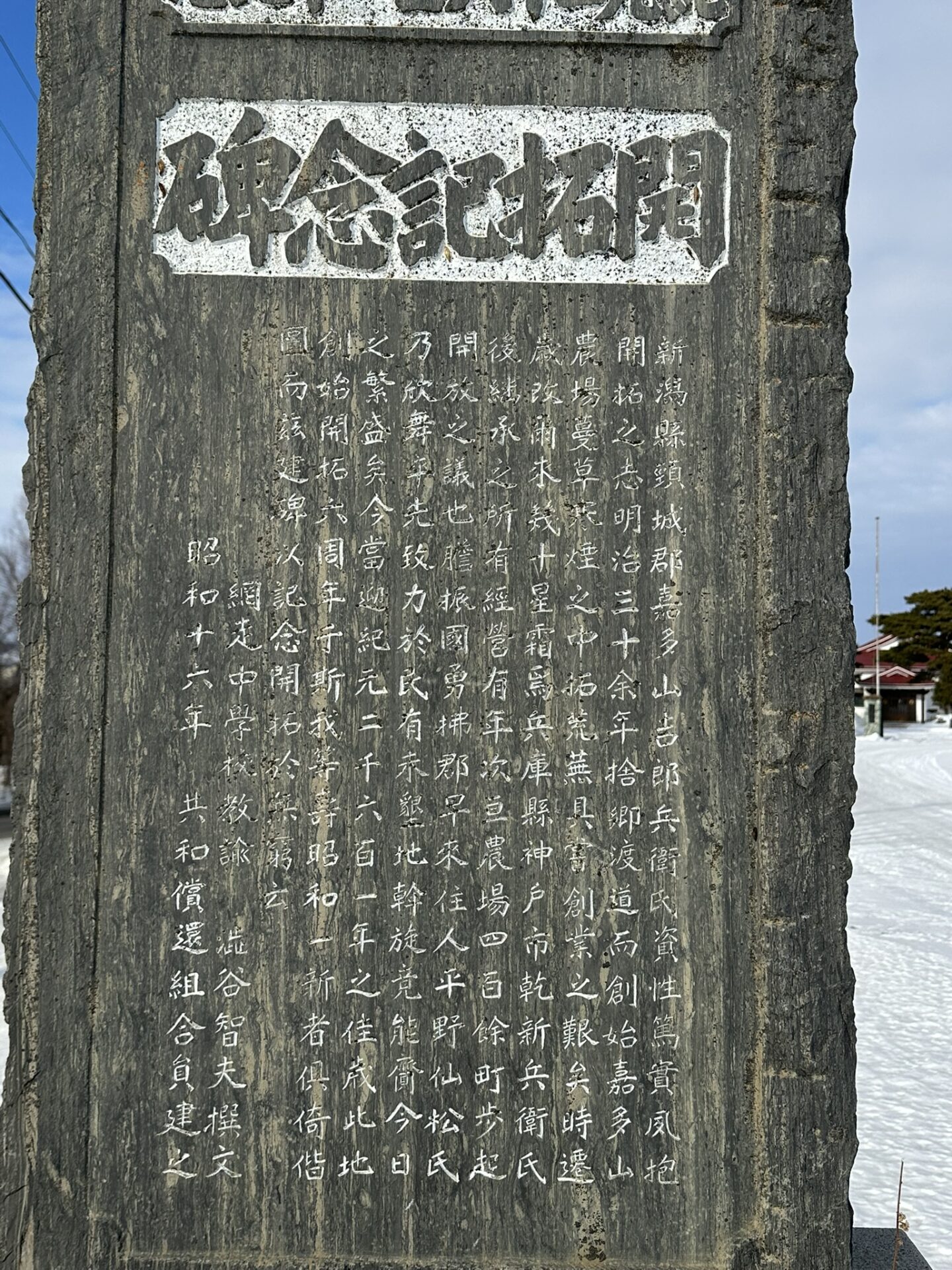 新潟県頸城軍嘉多山吉郎兵衛氏資性篤実夙抱開拓之志明治三十余年捨郷渡道而創始嘉多山農場蔦草寒煙之中拓荒蕪具嘗創業之艱矣時遷歳改爾来幾十星霜為兵庫県神戸市乾新兵衛氏後継承之所有経営有年次亘農場四百余町歩起開放之議也謄振圀勇払郡早来住人平野仙松氏乃欣舞平先致力於氏有未墾地斡旋竟能斎今日之繁盛矣今当迎紀元二千六百一年之佳歳此地創始開拓六周年于暫斯我等壽昭和一新者倶倚偕円而茲建碑以記念開拓於無窮云 網走中学校教諭 澁谷智夫撰文 昭和十六年 共和償還組合員建立