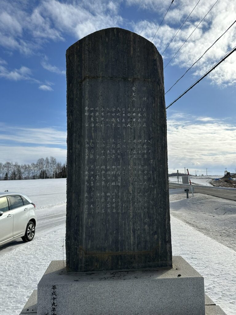 網走市の天都山にクロスカントリースキーの練習に向かう途中、少し時間があるので卯原内方面を経由して行くことにする。道道591号線を通り隆法寺のところに開拓記念碑があった。