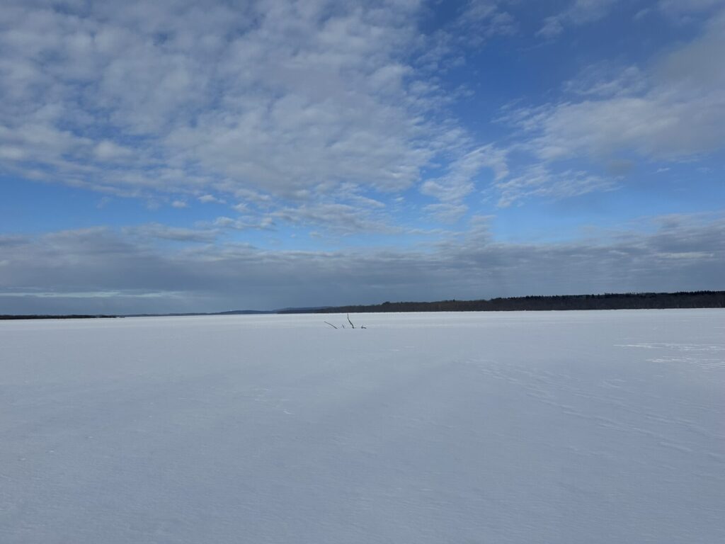 17日(土)は、道立オホーツク公園がアイスバーンでガリガリなので、凍結した網走湖を滑った。一面は氷の世界、無風で素晴らしい景色であった。網走のクロスカントリースキー仲間と二人で、目的地が必要だということで、女満別駅の裏まで滑ることにした。途中少し氷があり滑りづらかったが、総じて素晴らしい練習であった。