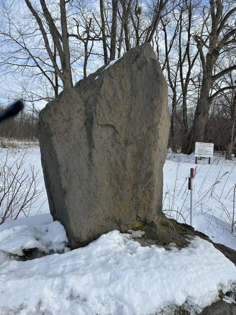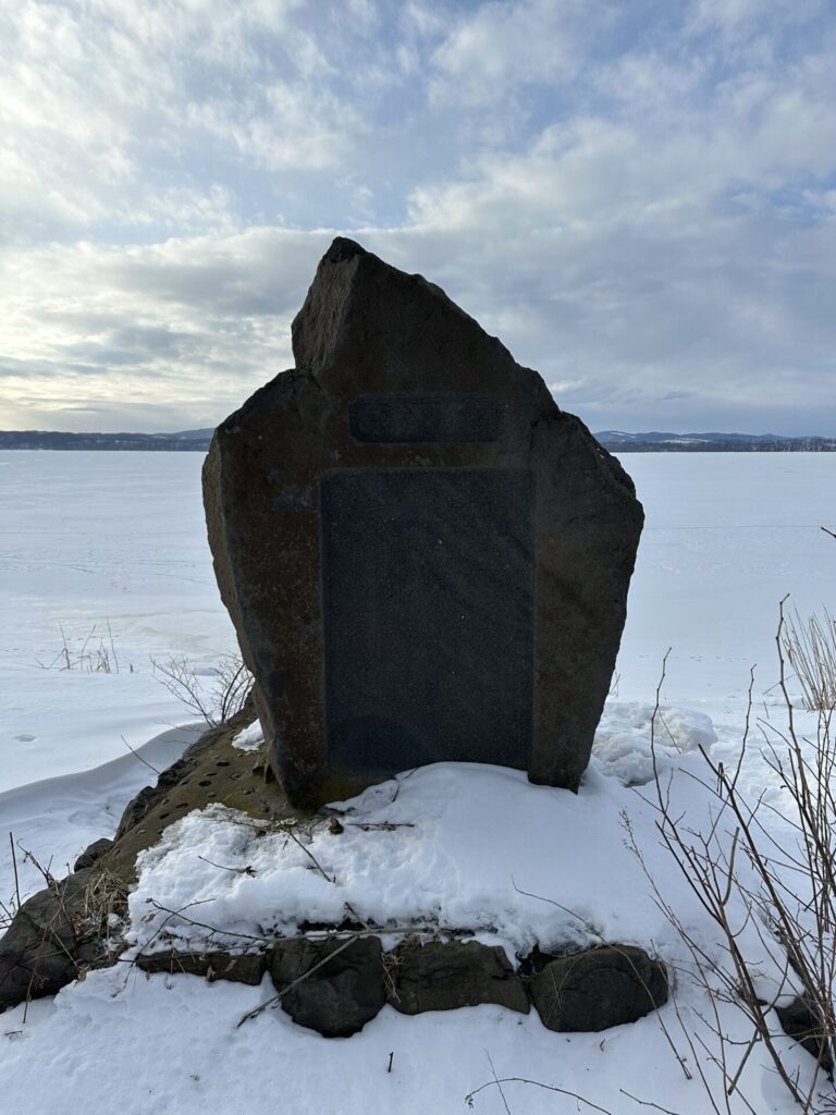 また、途中、半島のところに石碑が見えた。ここは通常の道路では発見することができず、湖からでしか到達することができない。しかし残念ながら文字は判別不能だった。