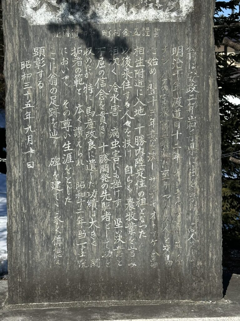 表面には「翁は安政2年岩手県に生を享け、商人として明治10年渡道、同12年 オトフケプト モッケナシ 今の宝来富丘附近に到りアイヌ人と交易を始め、翌13年意を決し サッテキオトフケ 今の相生附近に入地、十勝内陸定住の祖となった。以後来住する人々を抉け、自らも農牧畜を営み、相次ぐ冷水害、病害虫にも挫けず堅い決意と不屈の信念を貫き、十勝開発の先駆者として功を収めたが、特に馬産改良に遺した功績は大きく開拓者の範と広く讃えられ、昭和12年当下士幌において、その尊い生涯をとじた。こゝに翁の足跡を辿り、碑を建てゝ永くその偉徳を顕彰する。昭和35年9月10日」。