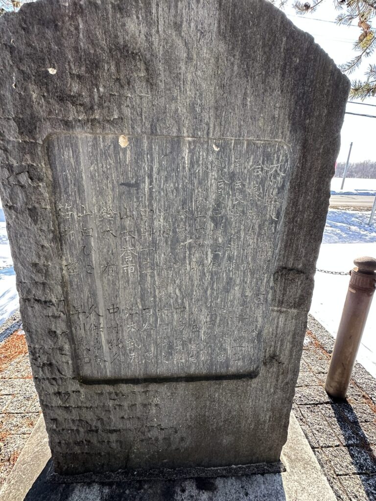裏面に「大川宇八郎顕彰碑建立期成会」とあり会長1名、副会長2名、役員13名、事務局6名の名前が刻まれている。道北の釣りと旅さんのサイトによると、次のような情報があったので転載させていただく。「碑には記載されていないが明治16年に河川の鮭魚が禁止され明治17年の4月頃にはアイヌ民族が餓死寸前に陥いり、晩成社の依田勉三や鈴木藤太郎らとともに緊急に食料を調達し配ると共に、札幌に出向き早急な措置を求めている。晩成社の日誌4月20日付けにも記録が残されていた。」