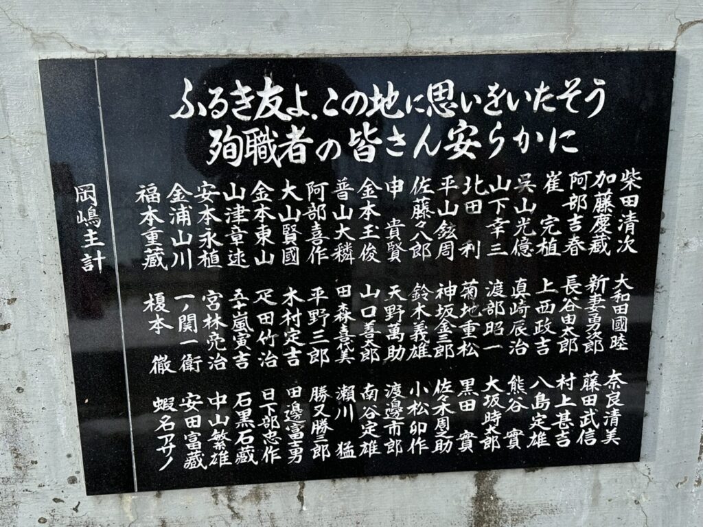 黒御影石の正面には上記のとおり刻まれ、その下の台座には「ふるき友よ、この地に思いをいたそう 殉職者の皆さん安らかに」と刻まれ、おそらく多数の殉職者の使命が刻まれている。