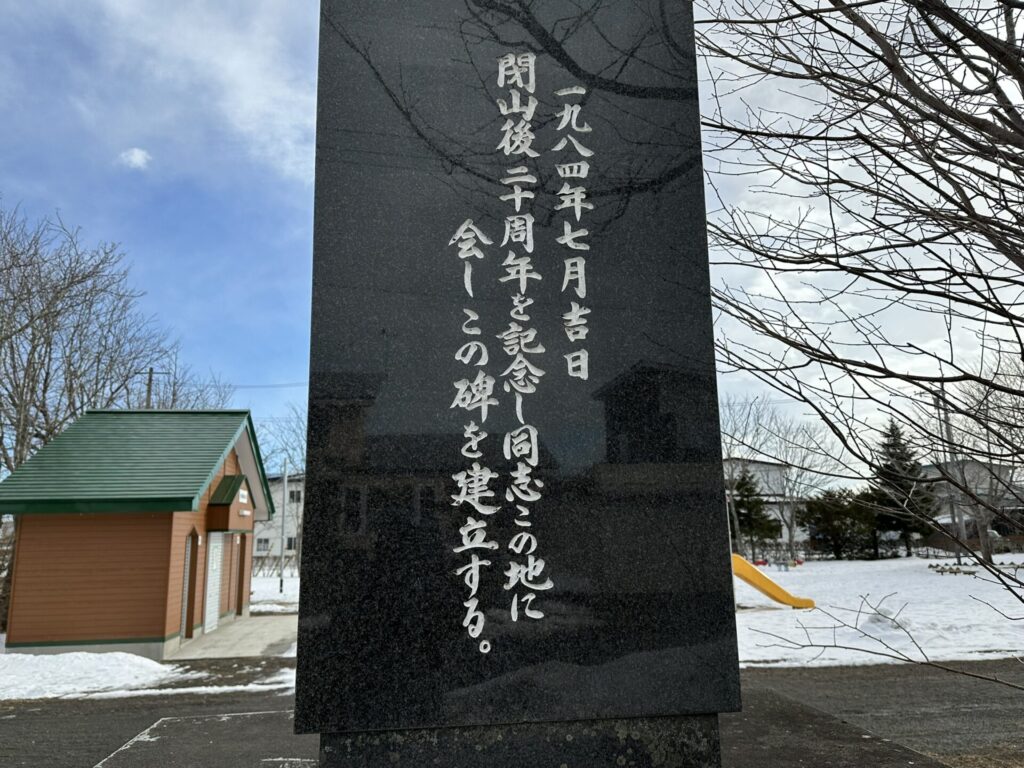 裏面には「1984年7月吉日 閉山後20周年を記念し同志この地に会しこの碑を建立する。」と「史実 1937年明治鉱業(株)この碑より1200米の地に庶路炭鉱を開鉱本格操業に着手、1964年国の石炭政策により閉山となる。この間25年間精炭400万屯を生産最盛期には従業員数1350名をこえ、居住区も清水町・住吉町・青葉町・弥生町・花園町・錦町・朝日町・汐見町・千鳥町・栄町と、現西庶路市街の基盤を作る。」と刻まれていた。
