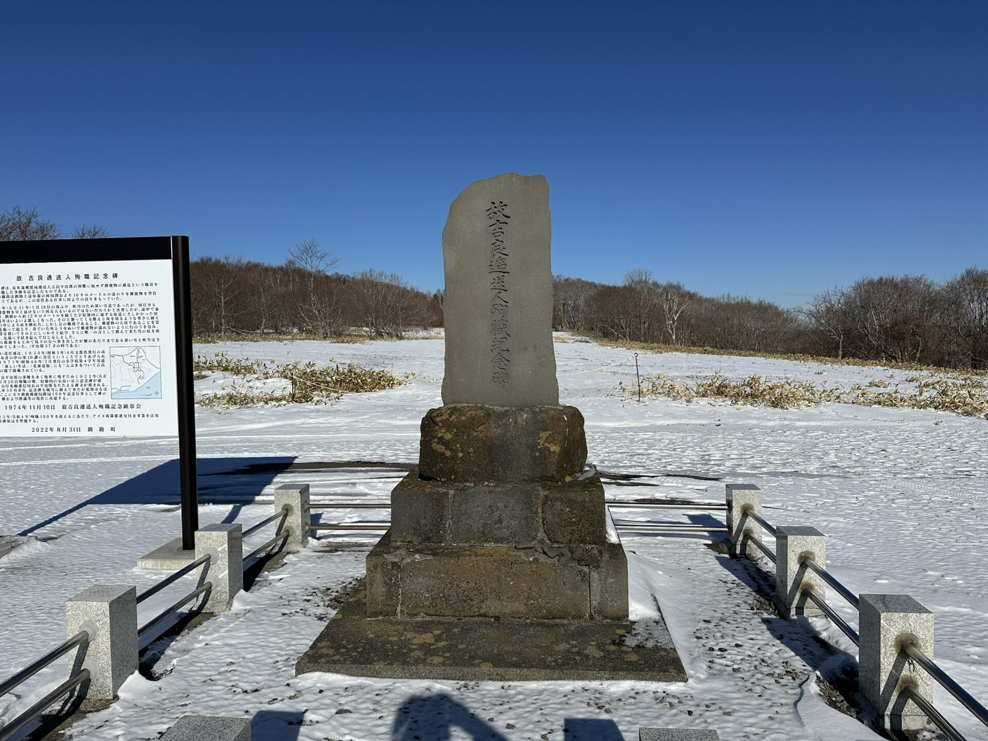 建立以来50有余年、記念碑も風雪に耐えて来たが荒廃はなはだしく、ここに至り釧路郵便局開局100周年記念行事として碑の改修築、柵および標識等の現状に再建する。1974年11月10日 故吉良逓送人殉職記念顕彰会 2022年(令和4年)殉職100周年を迎えるにあたり、アイヌ政策推進交付金事業を活用して記念碑周辺を整備する。2022年8月31日 釧路町