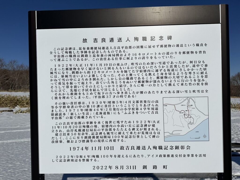 この記念碑は、昆布森郵便逓送人吉良平治郎の困難に屈せず郵便物の逓送という職責を全うして殉職した事跡を記念したものである。