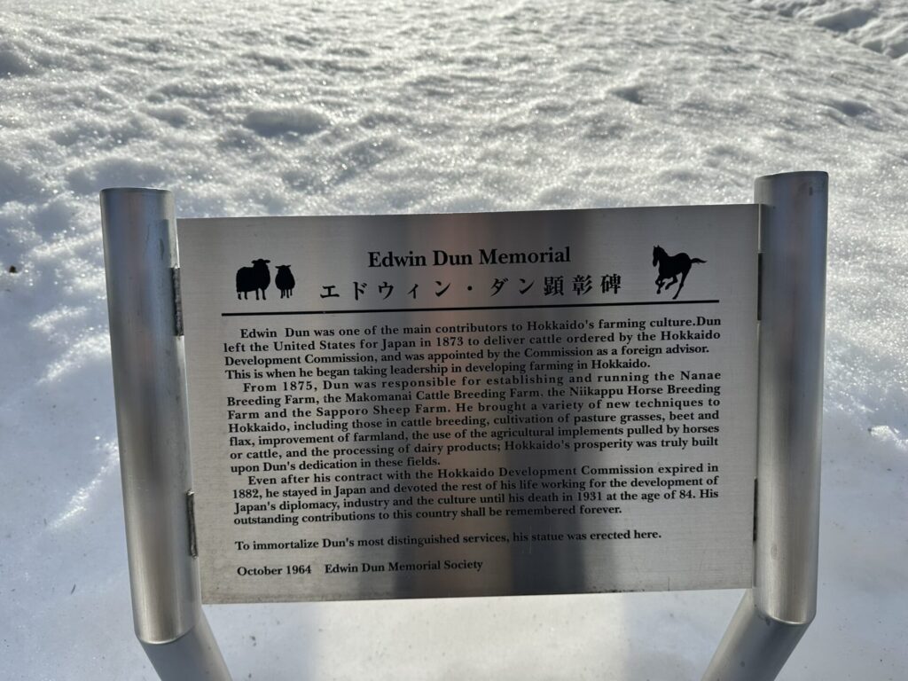 From 1875, Dun was responsible for establishing and running the Nanae Breeding Farm, the Makomanai Cattle Breeding Farm, Niikappu Horse Breeding Farm and Sapporo Sheep Farm. He brought a variety of new techniques to Hokkaido, including those in cattle breeding, Cultivation of pasture grassed, beet and flax, improvement of farmland, the use of the agricultural implements pulled by horsed or cattle, and the processing of dairy products; Hokkaido’s prosperity was truly built upon Dun’s dedication in these fields.