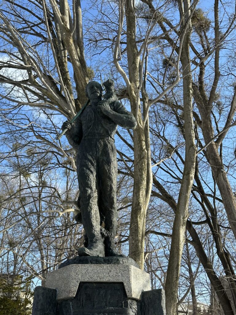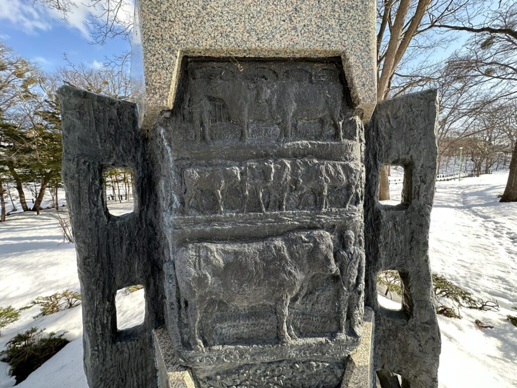 作業着姿らしいエドウィン・ダンが子羊らしき動物とフォークを背負った像である。その下の基台には牛の様子が彫られ、一番下には牛を引っ張っているダンらしい人物が彫られている。一番したには「Edwin Dun」エドウィン・ダンと彫られていた。