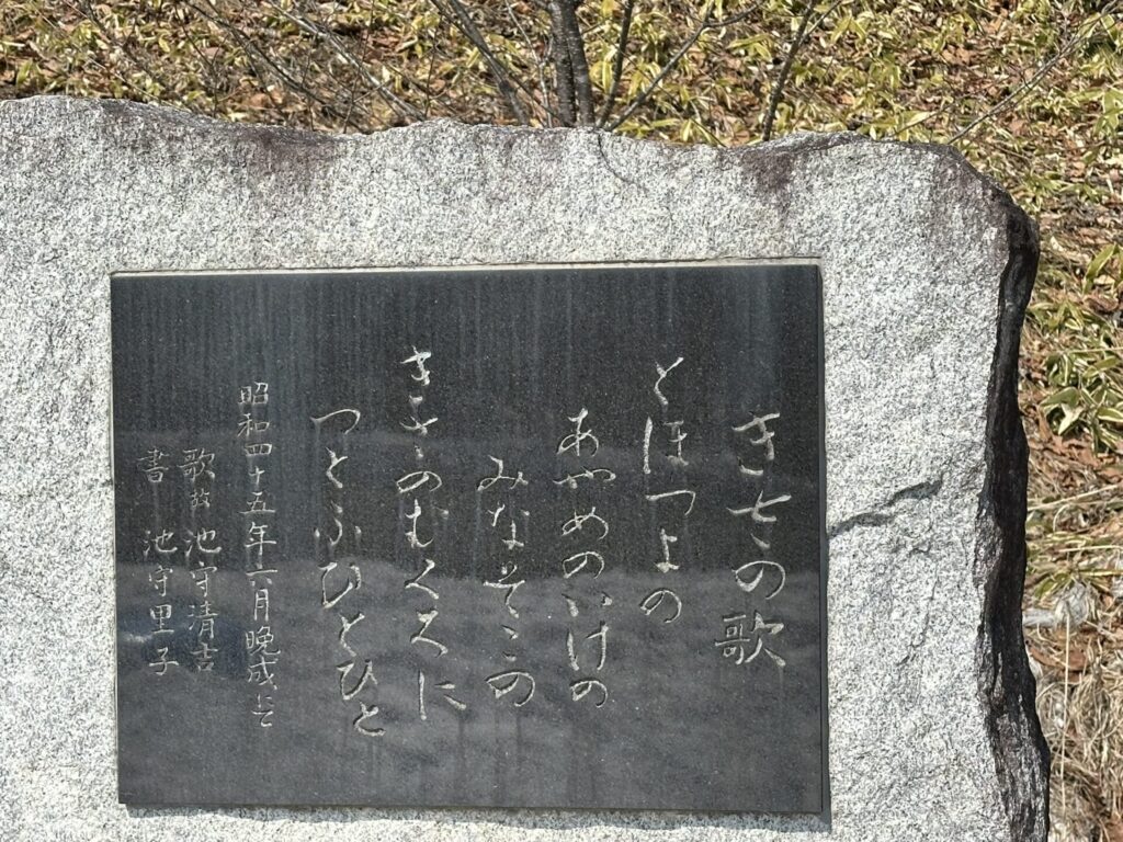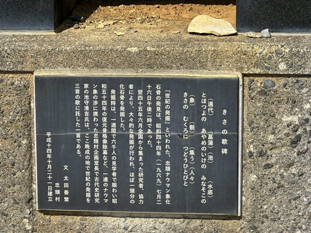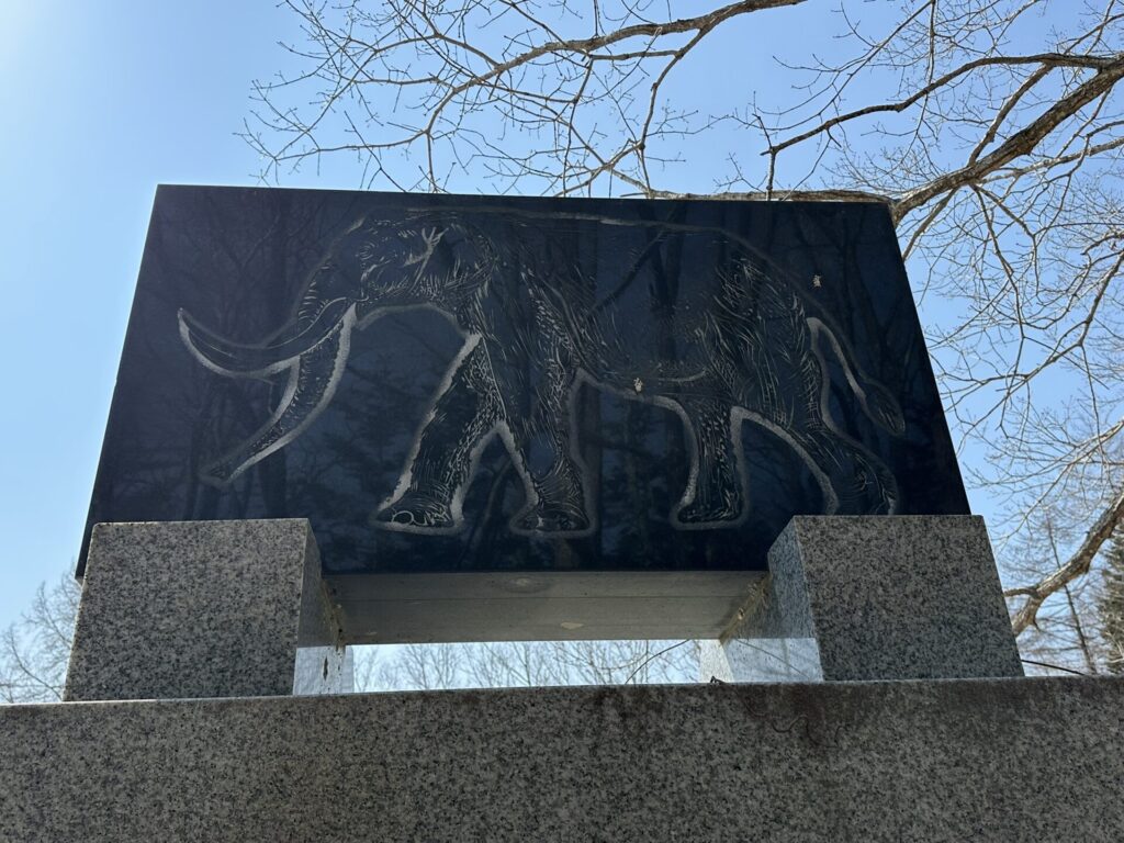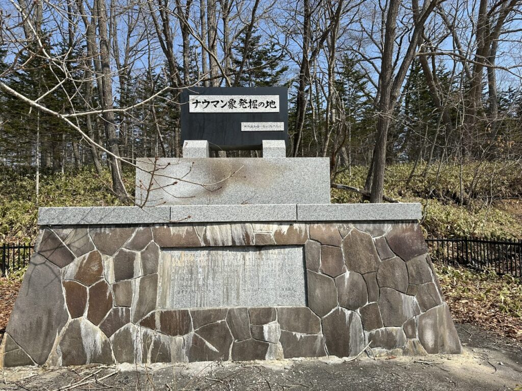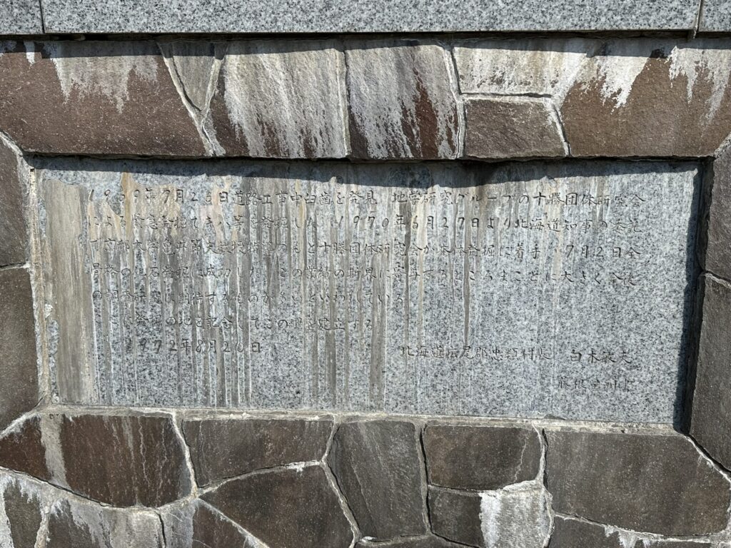 石碑の表面に上記のとおり刻まれ、その下に「北海道知事 堂垣内尚弘書」と添えられている。その下の碑文には次のとおり刻まれていた。「1969年7月26日 道路工事中臼歯を発見 地学研究グループのトカチ団体研究会による緊急発掘でキバ等を発掘した 1970年6月27日より北海道知事の委託で京都大学亀井節夫教授指導のもと十勝団体研究会が本体発掘に着手 7月2日全骨格の化石発掘に成功した この業績斯界に寄与するところまことに大きく 今後の調査研究に期待するものが多いといわれている ここに発掘の地を記念してこの碑を建立する 1972年8月20日」