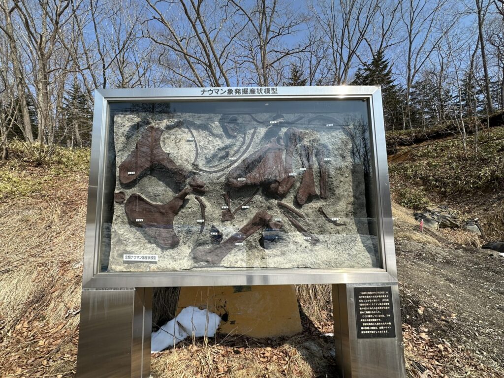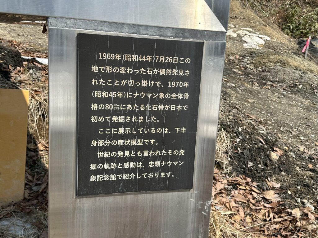 1969年7月26日この地で形の変わった石が偶然発見されたことがきっかけで、1970年にナウマン象の全体骨格の80パーセントにあたる化石骨が日本で初めて発掘されました。ここに展示しているのは下半身部分の産状模型です。世紀の大発見とも言われたその発掘の奇跡と感動は、虫類ナウマン象記念館で紹介しております。